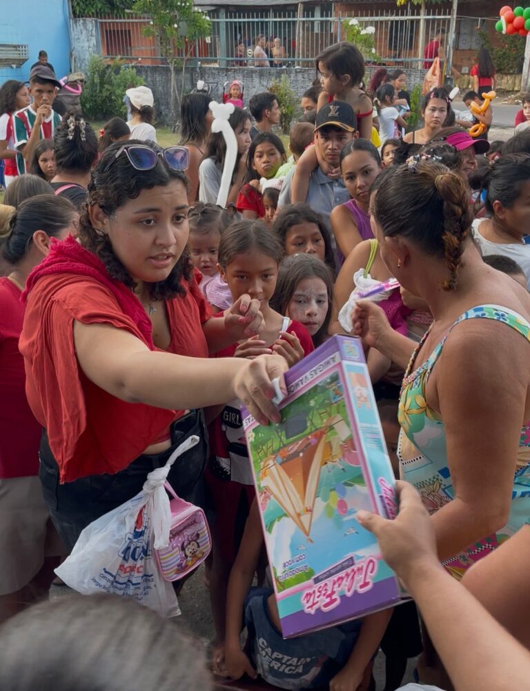 Em comemoração ao Dia das Crianças, a equipe do Instituto Fortis promoveu uma ação especial para as crianças da comunidade Bela Vista, localizada no bairro Puraquequara. O evento aconteceu na área externa do refeitório Pão e Paraíso, da Igreja Imaculada Conceição, e reuniu momentos de muita alegria, brincadeiras e solidariedade.